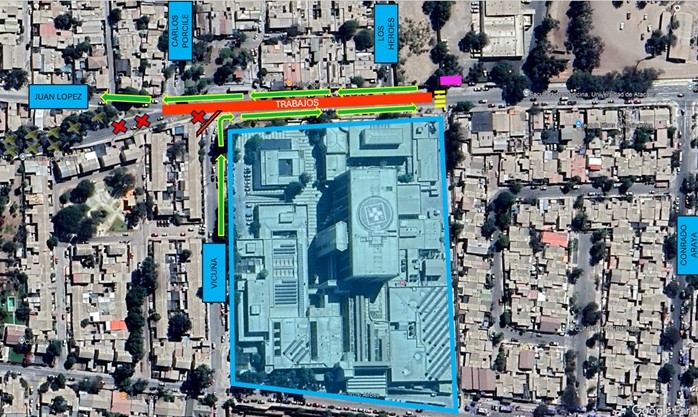 Rutas alternativas sugeridas: Para quienes se desplazan por calle Vicuña y deban dirigirse hacia el centro: Tomar calle O’Higgins hacia el oriente, luego Conrado Araya hacia el norte y, finalmente, girar para retomar Avenida Los Carrera en dirección al centro.